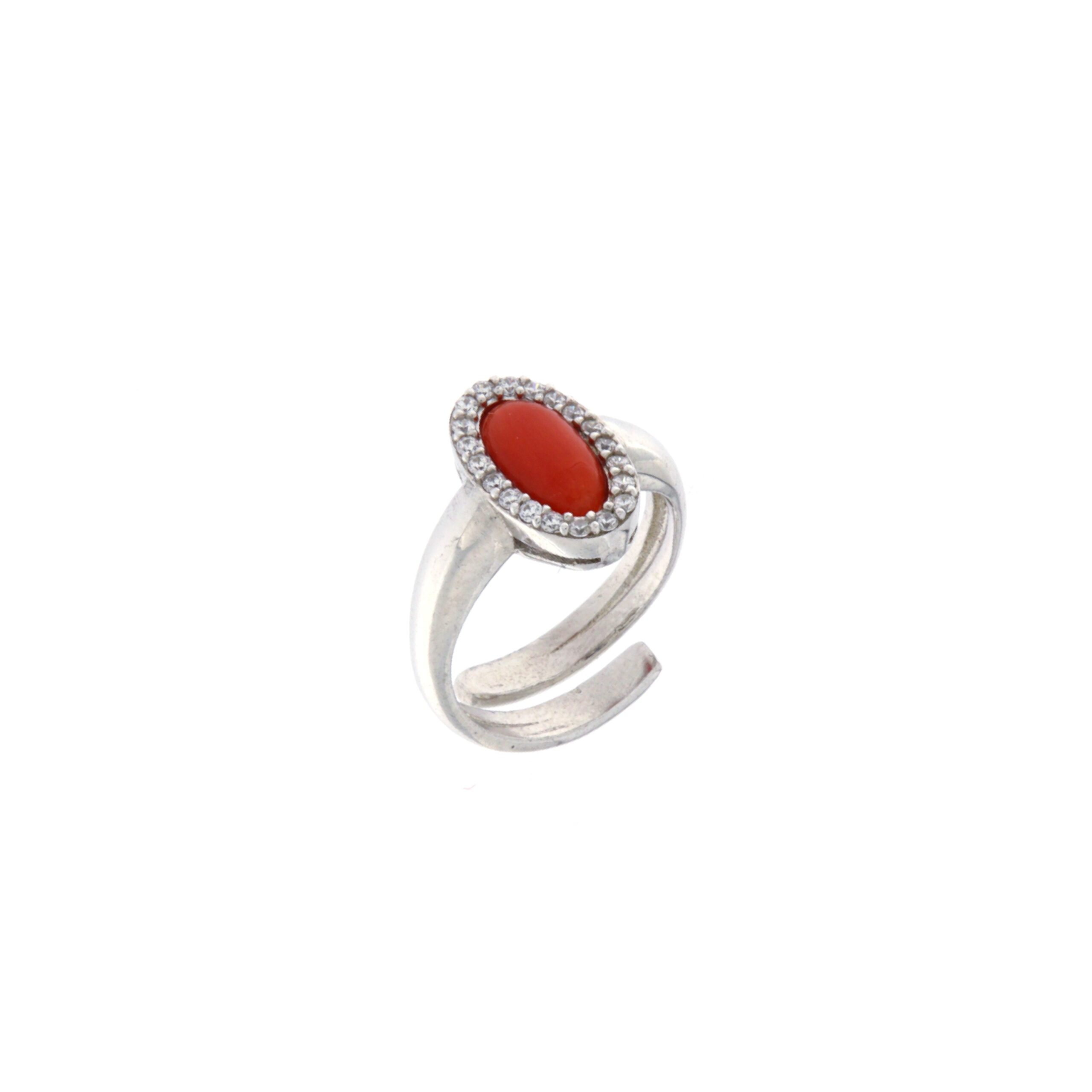Anello regolabile in argento, con spola di corallo ovale, contorntata di zirconi