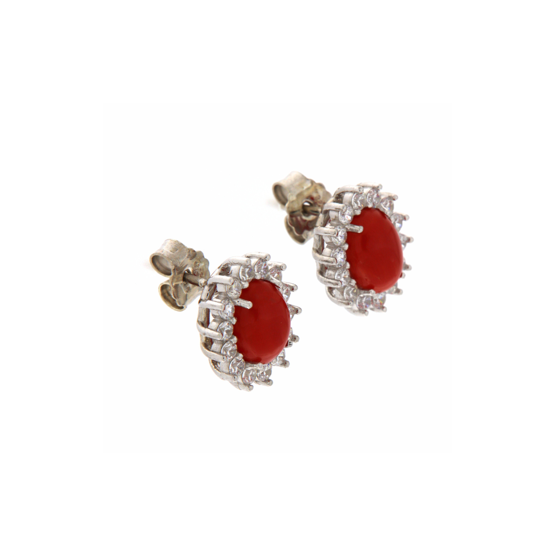 Completo composto da orecchini e anello regolabile in argento e spole di corallo tonde, contornate di zirconi
